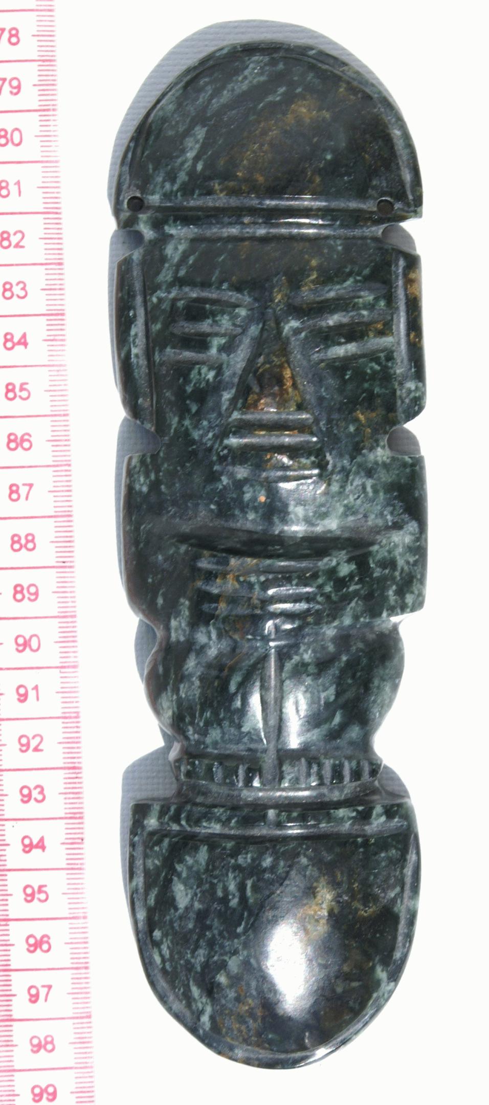 Este Tumix de 20 cm es una pieza escultórica ecuatoriana meticulosamente tallada, elaborada en jade natural por artesanos indígenas. Cada curva y superficie pulida refleja técnicas tradicionales, lo que lo convierte en un atractivo punto focal para coleccionistas o en un elemento destacado en exhibiciones culturales o de galerías.