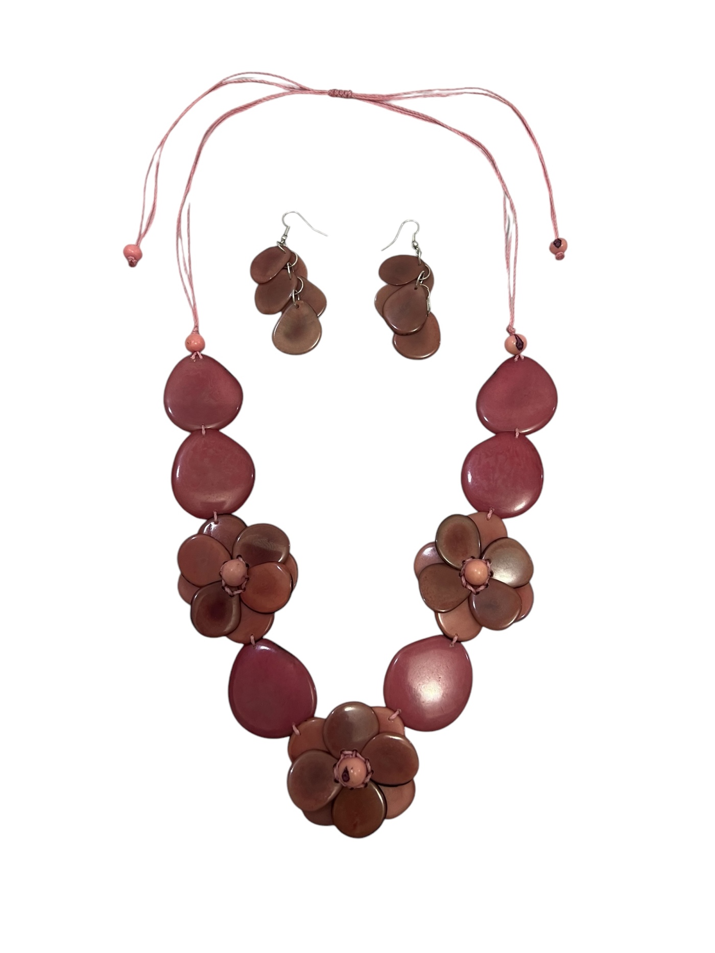 Este conjunto artesanal incluye un collar y aretes a juego hechos de tagua sostenible (marfil vegetal), con un peso promedio combinado de 150 g. Los tonos crema naturales y el acabado suave resaltan la elegancia orgánica de la tagua, lo que convierte a este conjunto en una pieza destacada de moda ecológica que, a la vez, ofrece un gran impacto visual.